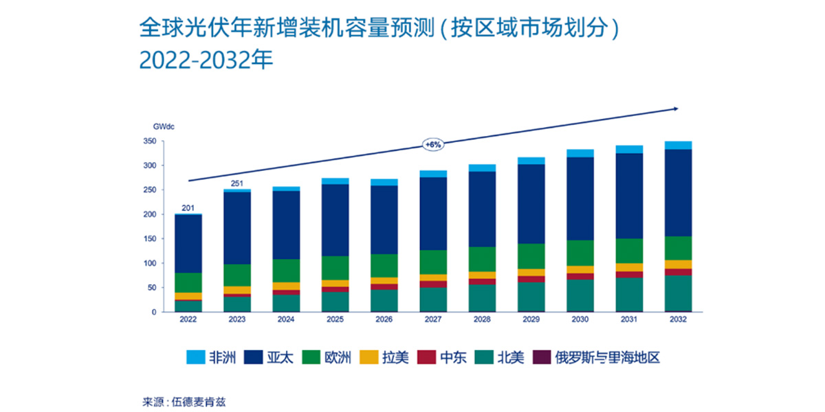 تتوقع شركة وود ماكنزي نموًا سنويًا متوسطًا بنسبة 6% لمنشآت الطاقة الشمسية الكهروضوئية العالمية في الفترة من 2022 إلى 2032، مع تجاوز أمريكا الشمالية للحصة السنوية لأوروبا بحلول عام 2028.