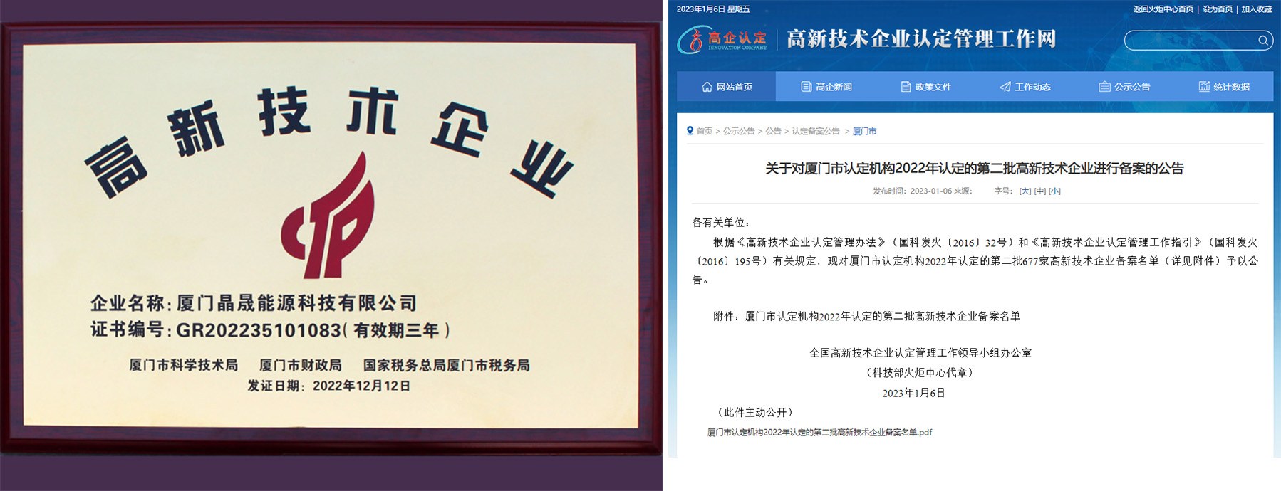 تتشرف شركة شيامن سولار فيرست إنرجي بكونها من بين 1497 شركة حاصلة على شهادة وطنية من هيئة الاعتماد في شيامن عام 2022 (الدفعة الأولى: 820، الدفعة الثانية: 677؛ وتنتمي سولار فيرست إلى الدفعة الثانية). يُظهر هذا الإنجاز نجاح أداء الشركة وتجسيدها لقيمها الأساسية: "الأداء، الابتكار، العميل أولاً، احترام الطبيعة والحب، وروح العقد".