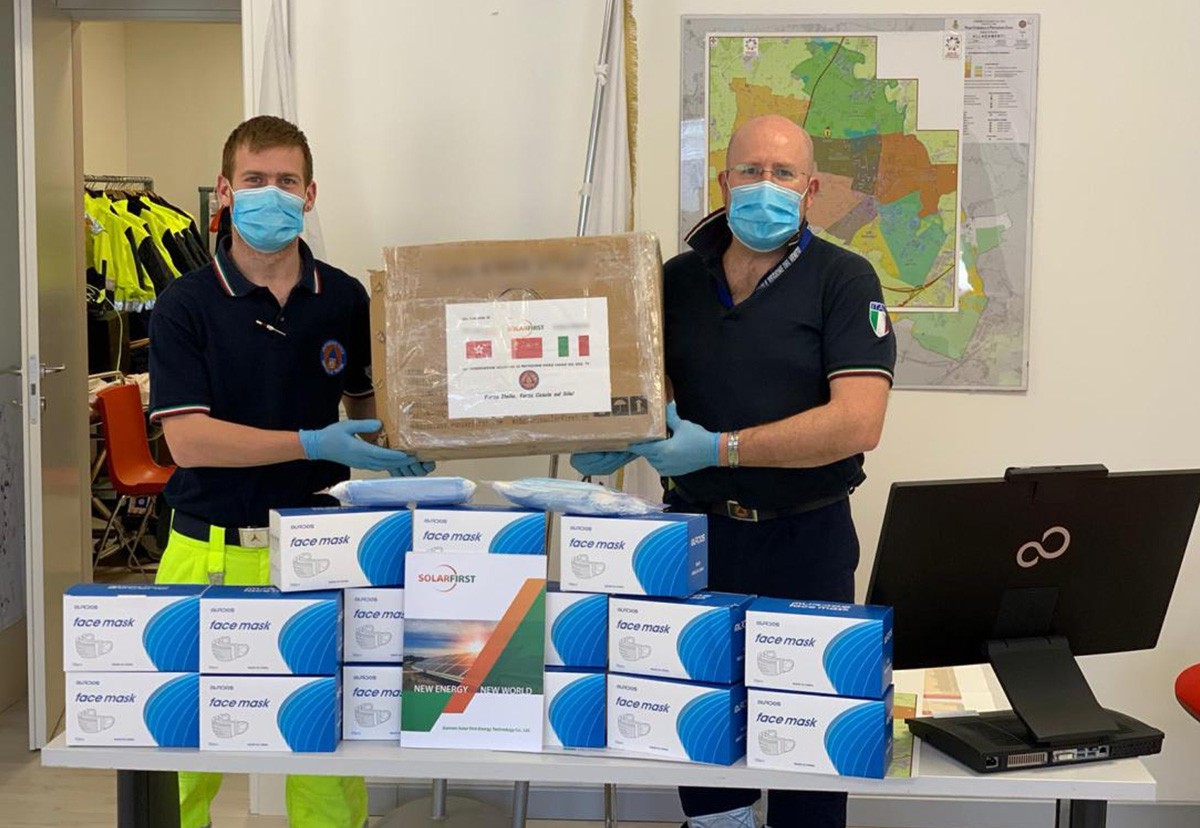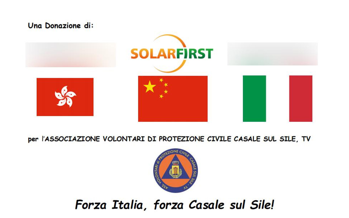 هناك مقولة صينية قديمة: "قطرة ماء تُردّ بالخير". لدعم جهود مكافحة الجائحة عالميًا، وبعد استئناف العمل والإنتاج، بدأت شركة SOLAR FIRST بجمع الإمدادات الطبية والتبرع بها لشركائها التجاريين والمؤسسات الطبية ومنظمات الرفاهية العامة والمجتمعات المحلية في أكثر من عشر دول، منها ماليزيا وإيطاليا والمملكة المتحدة والبرتغال وفرنسا والولايات المتحدة الأمريكية وتشيلي وجامايكا واليابان وكوريا الجنوبية وميانمار وتايلاند، وذلك من خلال عملائها وممثليها المحليين.