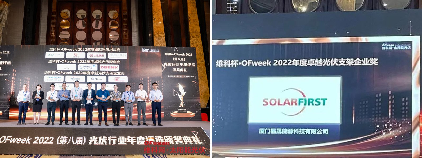 في 16 نوفمبر 2022، اختُتم بنجاح مؤتمر OFweek 2022 (الدورة الثالثة عشرة) لصناعة الطاقة الشمسية الكهروضوئية وحفل توزيع الجوائز السنوي، الذي استضافته OFweek، بوابة صناعة التكنولوجيا الفائقة في الصين، في مدينة شنتشن. وقد فازت شركة شيامن سولار فيرست إنرجي تكنولوجي المحدودة بجائزة "كأس فيكو لتميز الشركات في مجال حوامل الطاقة الشمسية" بفضل تميزها.