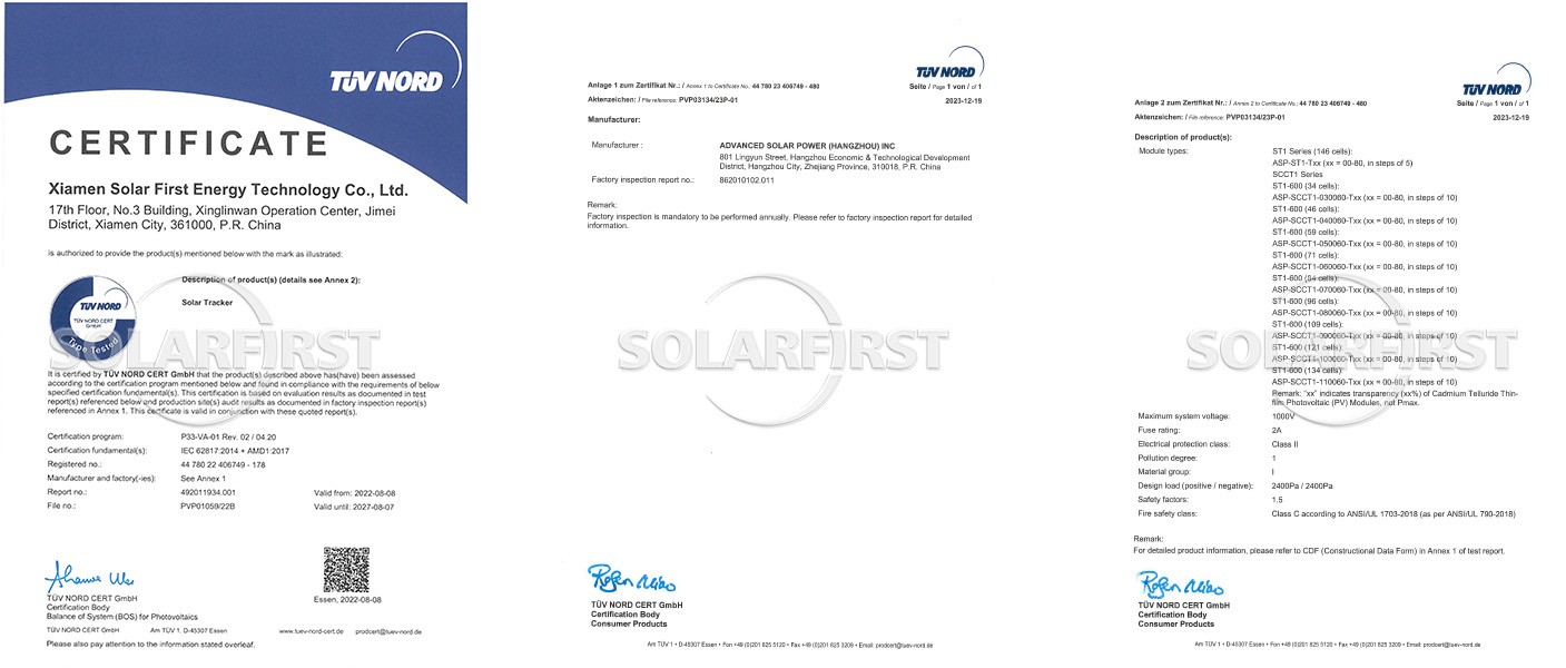 في أوائل أغسطس 2022، اجتازت أنظمة التتبع Horizon S-1V وHorizon D-2V، المطورة بشكل مستقل من قِبل مجموعة Solar First Group، بنجاح اختبارات الاعتماد التي أجرتها TÜV شمال ألمانيا، وحصلت على شهادة IEC 62817. يُسهم هذا الإنجاز في دفع منتجات التتبع من Solar First نحو الأسواق العالمية، مع تأكيد استقرارها وموثوقيتها من خلال الاعتراف العالمي الموثوق.