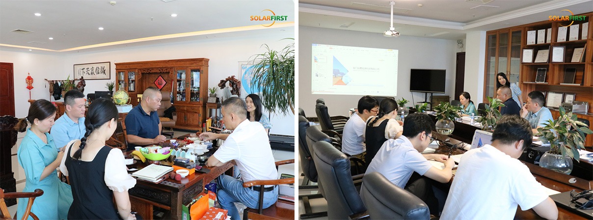 في 21 يوليو 2022، زار مسؤولون تنفيذيون من شركة شينيي لهندسة الزجاج (دونغقوان) المحدودة ("شينيي جلاس") مجموعة سولار فيرست. ضم الوفد نائب الرئيس لياو جيانغهونغ، ونائب المدير العام لي زيشوان، ومدير المبيعات تشو تشنغ هوا. وقد استضافهم رئيس مجموعة سولار فيرست، يي سونغ بينغ، والمدير العام تشو بينغ، لمناقشة الدعم التعاوني لأبحاث وتطوير منتجات الطاقة الكهروضوئية المتكاملة للمباني (BIPV).