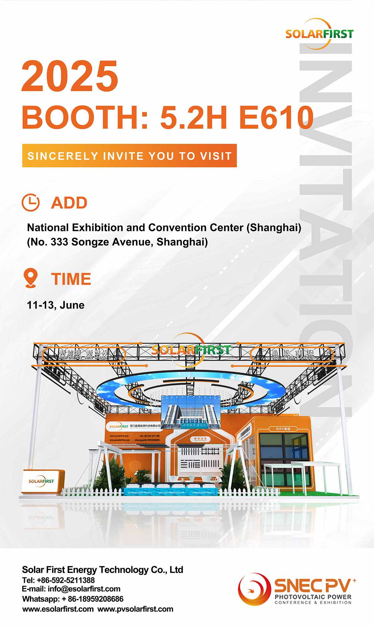 ترحب بكم مجموعة سولار فيرست بحفاوة في المؤتمر الدولي الثامن عشر للطاقة الشمسية الكهروضوئية والطاقة الذكية (SNEC) (شنغهاي)، الذي يُعقد في الفترة من 11 إلى 13 يونيو 2025 في مركز شنغهاي الوطني للمؤتمرات. تفضلوا بزيارتنا في الجناح 5.2H-E610 للاطلاع على حلول الطاقة النظيفة المتطورة ومناقشة فرص التعاون في مجال التنمية المستدامة.
