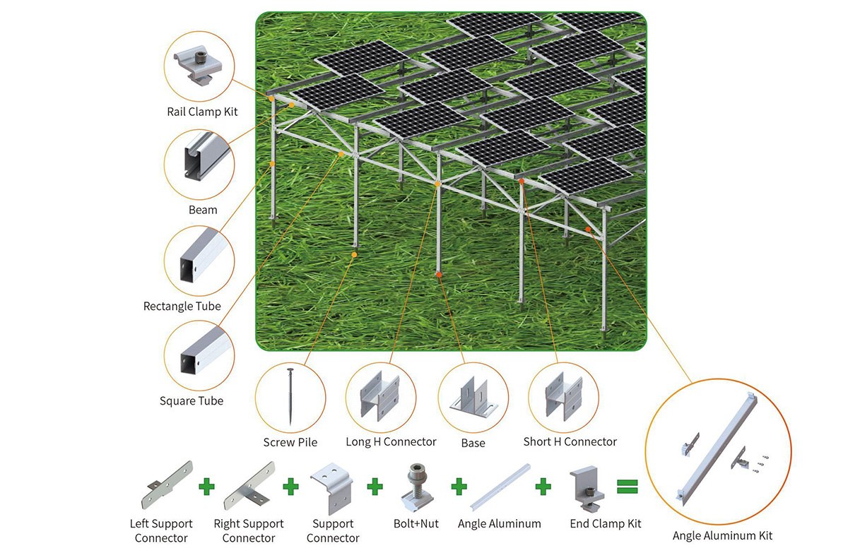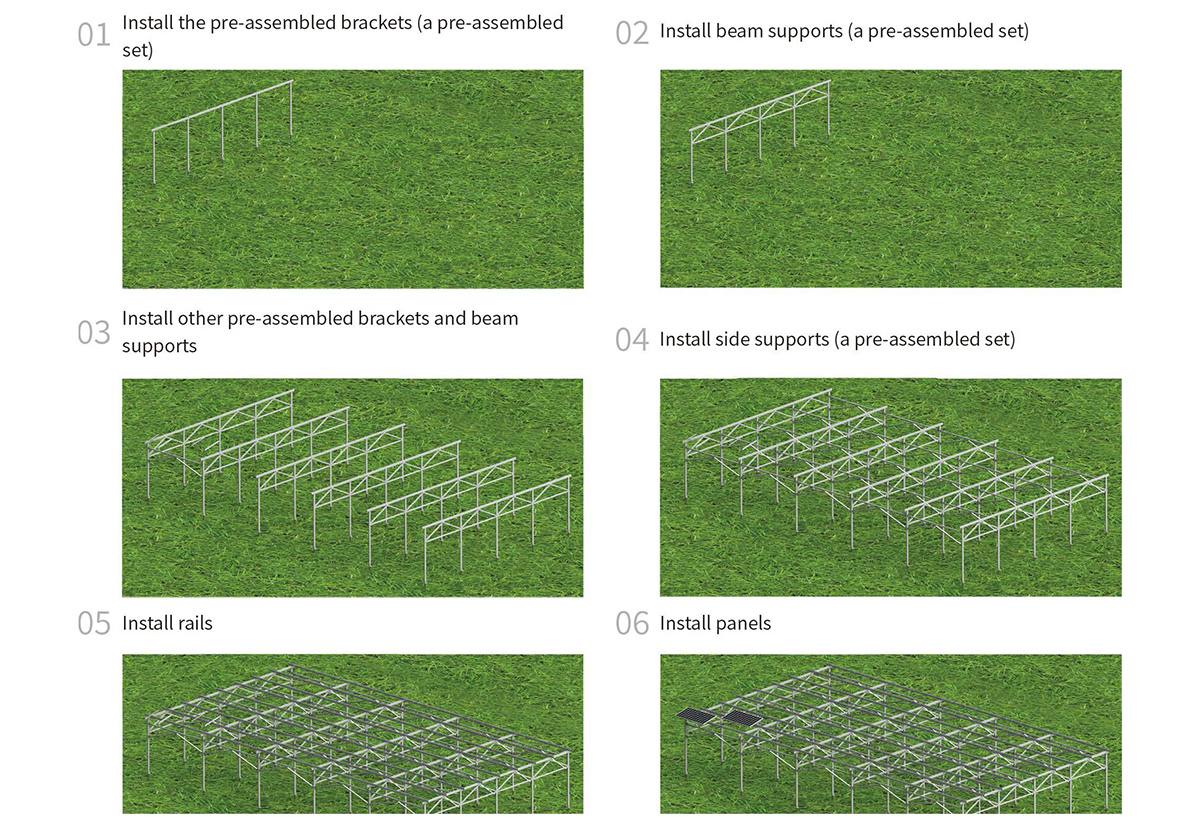 صُمم نظام تركيب الألواح الشمسية الزراعية هذا بمرونة عالية: يمكن بناؤه بشكل مرتفع يسمح بمرور الآلات الزراعية من تحته، ومتباعد بحيث يصل ضوء الشمس إلى المحاصيل بين صفوف الألواح الشمسية. وللتطبيقات التي تتطلب تغطية كاملة، مثل حظائر الماشية، وزراعة الفطريات، والصوبات الزراعية، يمكن أيضًا تصميم هيكل مقاوم للماء ومظلل بالكامل.