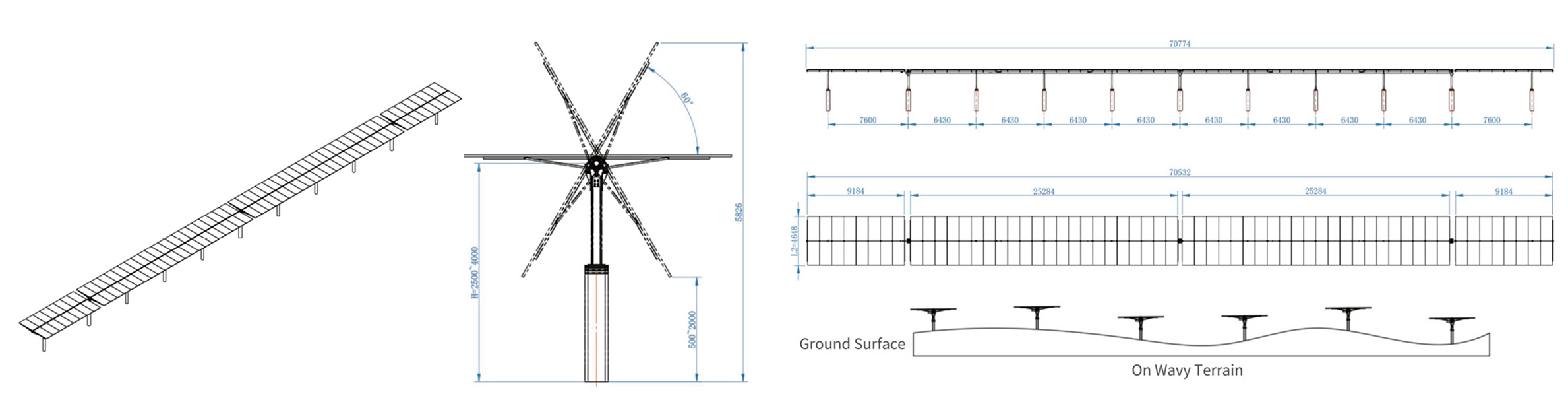 يتميز جهاز التتبع بقدرة تكيف تصل إلى 15% في اتجاه الشمال والجنوب، ويعمل بكفاءة عالية على التضاريس غير المستوية. يُحسّن نظام التشغيل متعدد النقاط مقاومة التواء الرياح بشكل كبير، ويرفع من تحمل سرعة الرياح الحرجة، مما يدعم التشغيل المستقر في رياح تصل سرعتها إلى 45 مترًا في الثانية. متوافق مع وحدات الطاقة الشمسية الخلوية بقطري 182 مم و210 مم، ويتسع كل جهاز لما يصل إلى 120 وحدة، ويمكن تهيئته لجهد نظام 1000 فولت أو 1500 فولت.