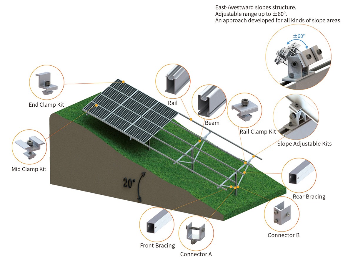 يستخدم النظام أكوامًا مدفوعة تُثبّت بكفاءة على الأراضي غير المستوية أو المنحدرة دون الحاجة إلى حفر مكثف. تُمكّن موصلات خاصة قابلة للتعديل من ضبط الألواح الشمسية بدقة باتجاه الجنوب، مما يُحسّن إنتاج الطاقة حتى في البيئات ذات التضاريس المعقدة.