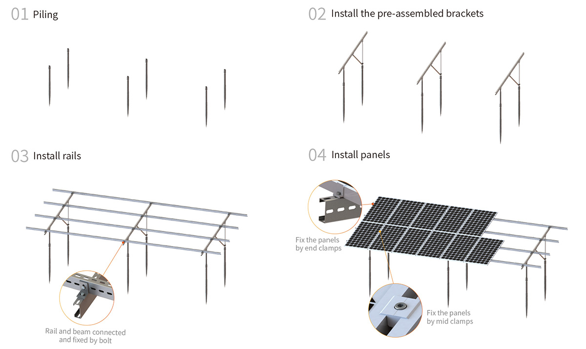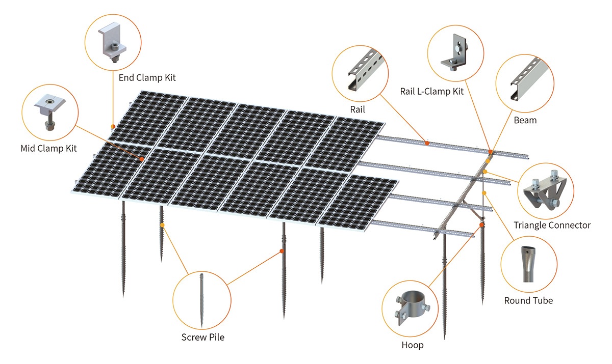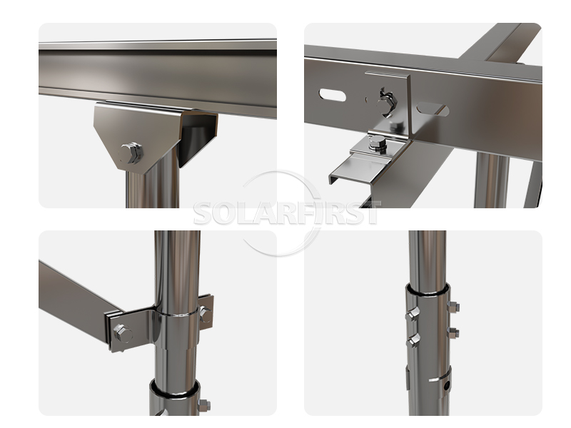 صُمم النظام مع مراعاة التنوع والفعالية من حيث التكلفة، ويستخدم مقاطع فولاذية مُحسّنة، مثل المقطعين C وU، لتقليل تكاليف المواد والعمالة مع تبسيط التركيب. سواءً استُخدم في محطات الطاقة الشمسية الضخمة أو المشاريع التجارية، يوفر هذا الحل خيارًا فعالًا ومتينًا للتركيب الأرضي للألواح الشمسية.