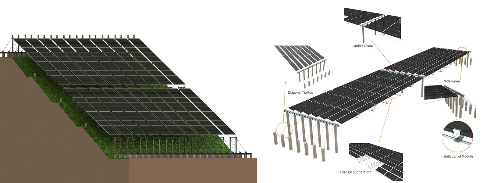 يحقق نظام دعم الكابلات المرن مزدوج الطبقة امتدادًا استثنائيًا يبلغ 50 مترًا أو أقل من خلال هيكل شبكة الكابلات المكانية، مما يوفر خلوصًا تشغيليًا يبلغ 6 أمتار أو أقل. بالمقارنة مع الدعامات الثابتة، يقلل هذا النظام من استهلاك أساسات الأكوام بنسبة 55%، وهو مثالي لحالات مثل محطات معالجة مياه الصرف الصحي، وتكامل الطاقة الشمسية في الزراعة، وتكامل الطاقة الشمسية في مصايد الأسماك، ويتوافق مع كود تصميم الهياكل الفولاذية GB50017-2017.