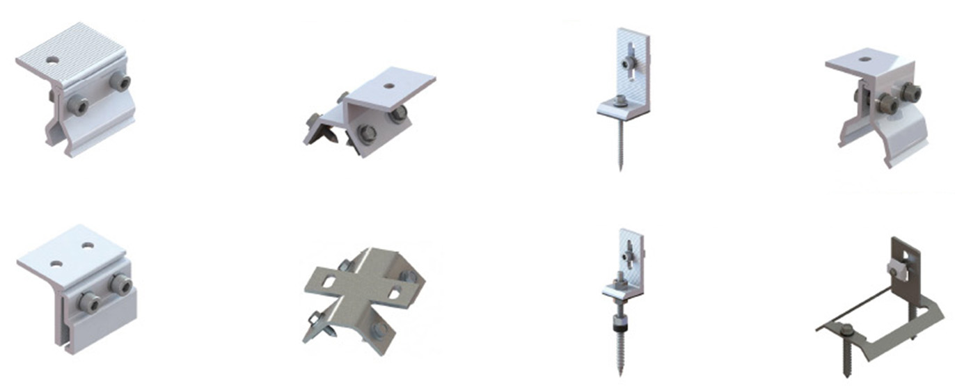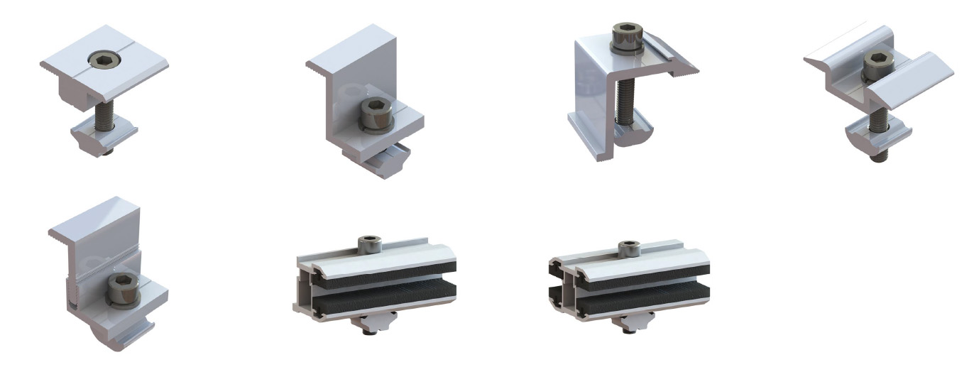 تتوفر المشابك بتصاميم متعددة، بما في ذلك خيارات تثبيت بمسامير مفردة أو مزدوجة، مما يُسهّل التركيب ويوفر الوقت. تتوافق مع تصميمات الألواح الطولية والعرضية، وتتكيف مع مختلف أشكال الأسقف المعدنية، مثل اللحامات المفردة أو المزدوجة، وتعمل مع معظم وحدات الطاقة الشمسية. تتيح المكونات الإضافية، مثل أقدام L، والأقدام الثابتة، أو مشابك الوحدات، تكاملاً مرنًا وسريعًا مع أنظمة السكك الحديدية الكاملة.